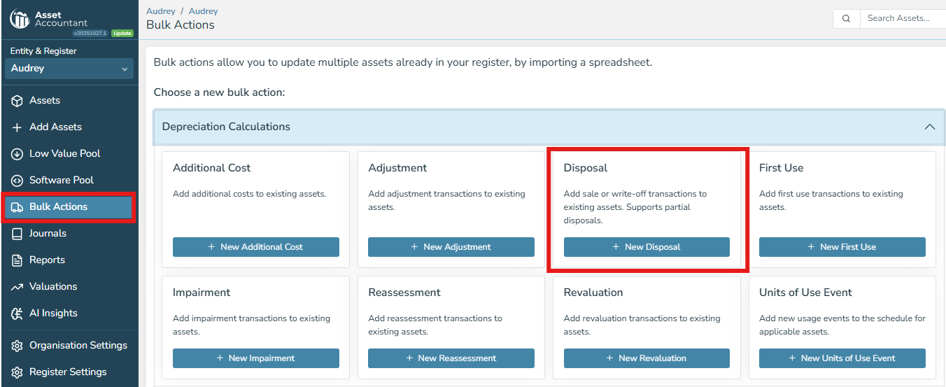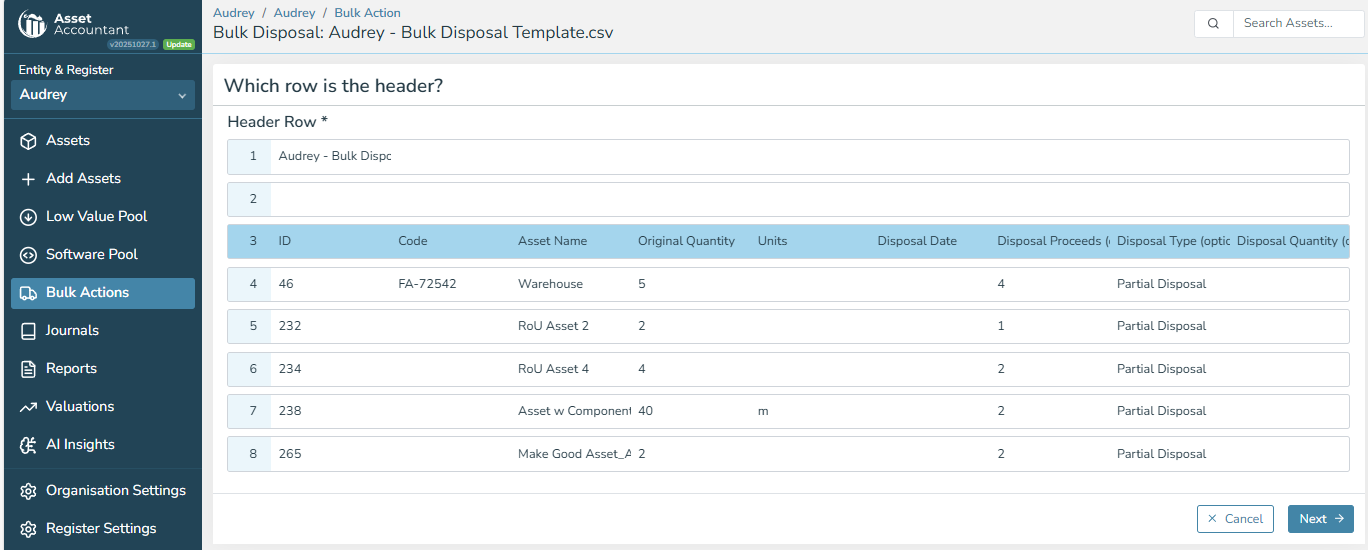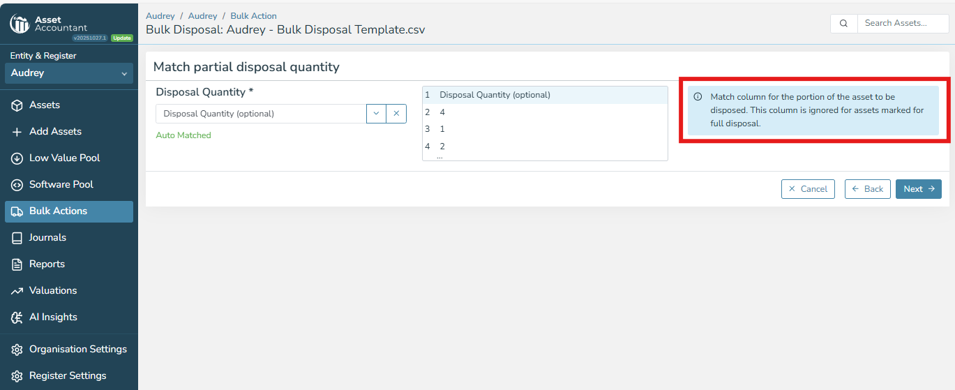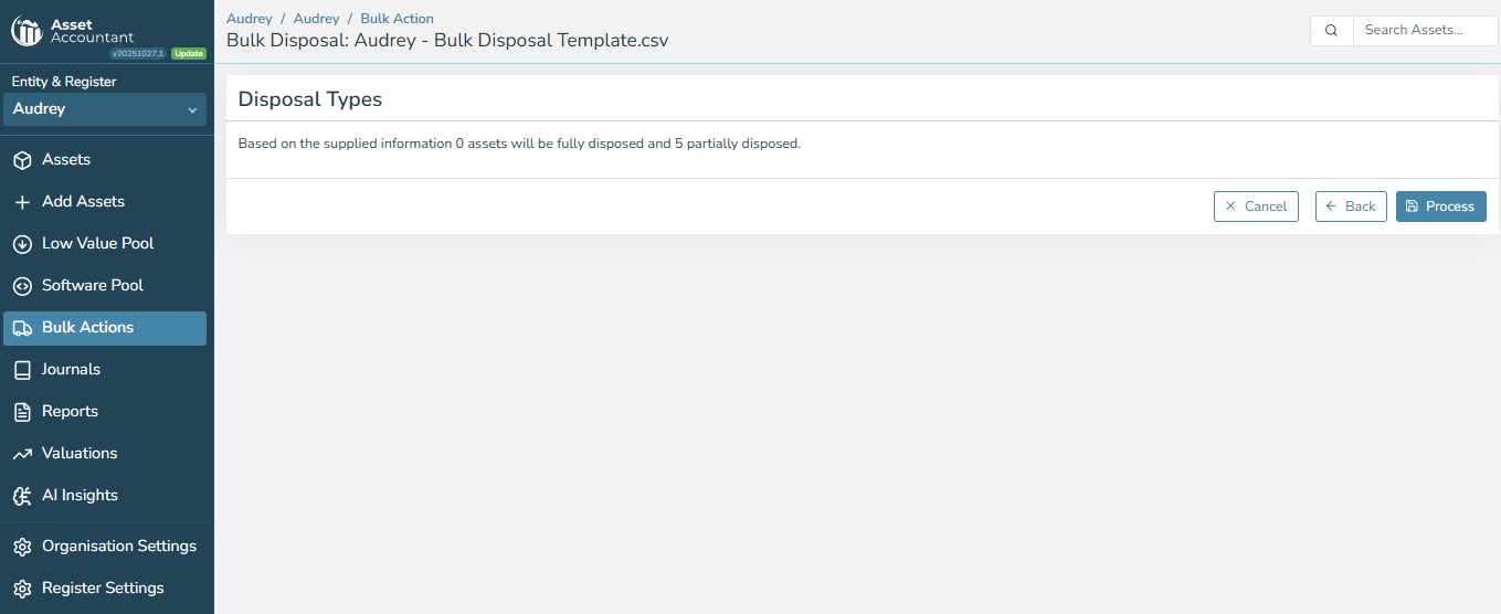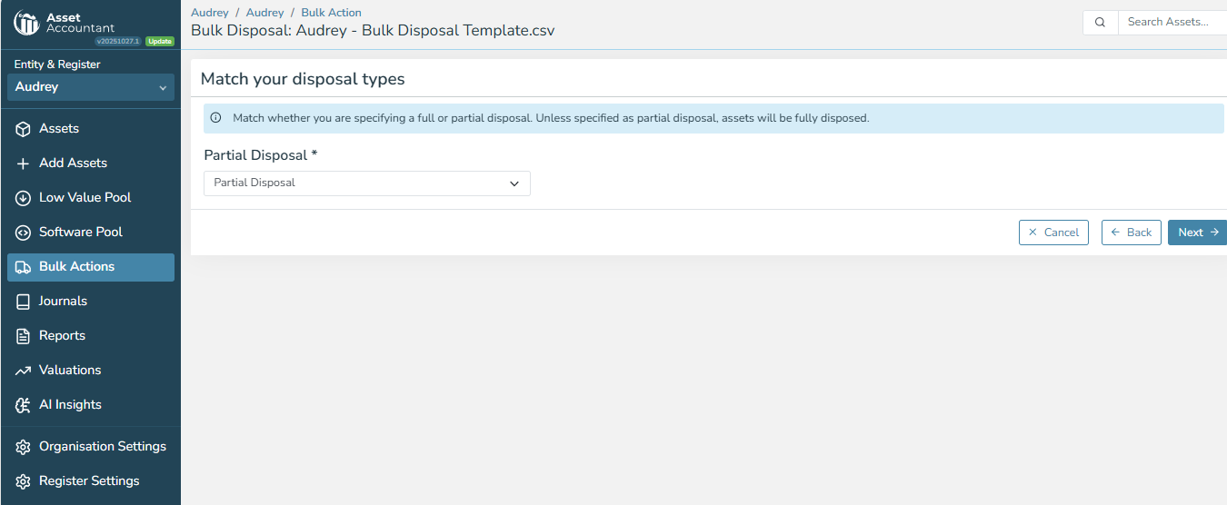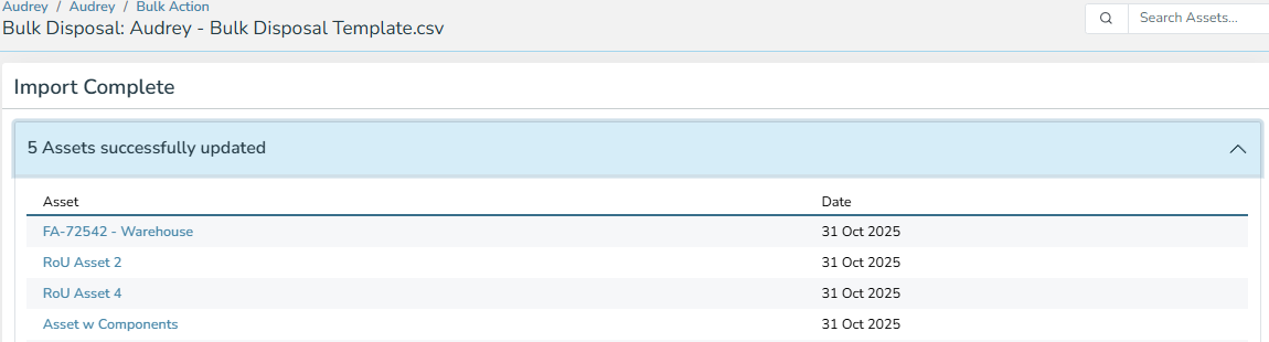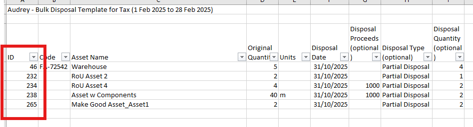 As part of enhancing our bulk disposal functionality, we have updated the current disposal import template to include a new field for "Disposal Type" and "Disposed Quantity". This update enables users to efficiently process large volumes of both full and partial asset disposals in a single import.
