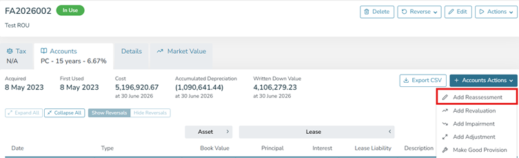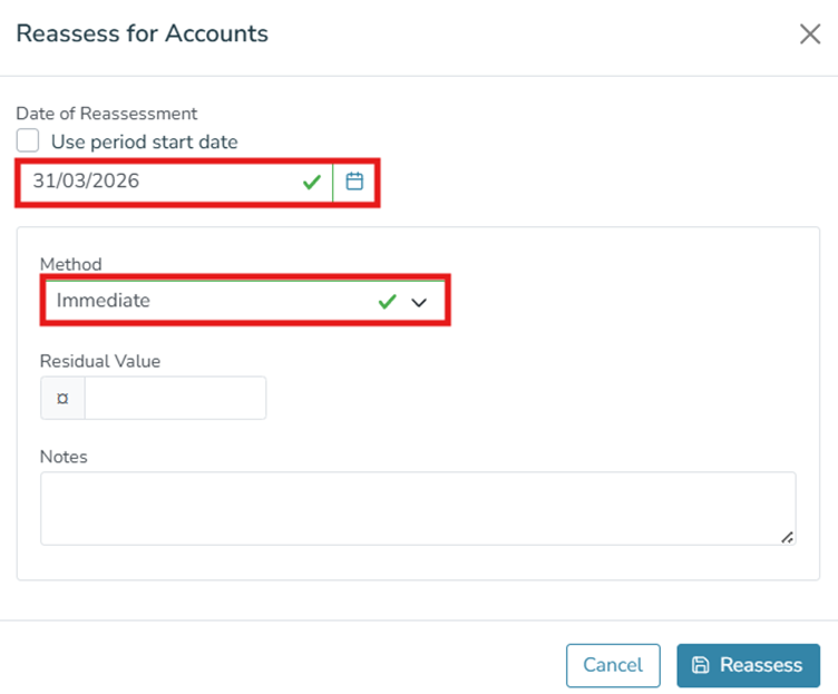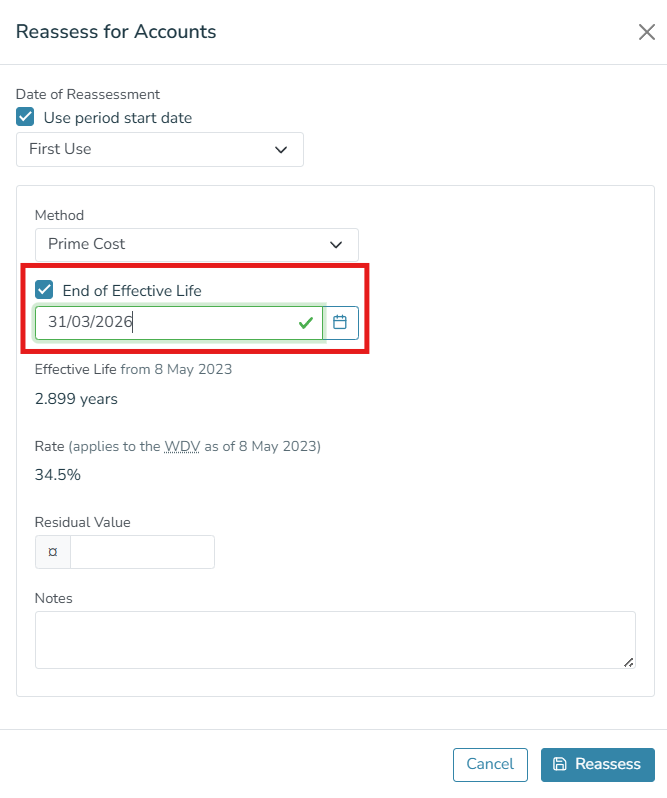 Choice 1: Perform a reassessment using the 'end of life' tick box to specify the date when the asset should have zero value (usually the result is smoother depreciation).